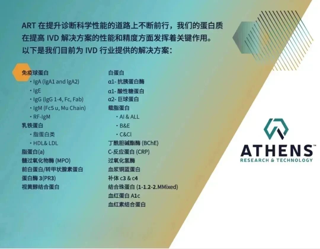 Athens Research & Technology公司(ART),自1986年成立以来,已近40年专注于生产优质天然蛋白质,致力于为体外诊断(IVD)行业及研究人员提供高纯度、高活性的产品。我们的制造流程严格,质量承诺值得信赖,确保客户能够依赖我们的蛋白质开发可靠、准确的诊断试剂,满足当今医疗保健的迫切需求。